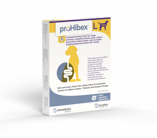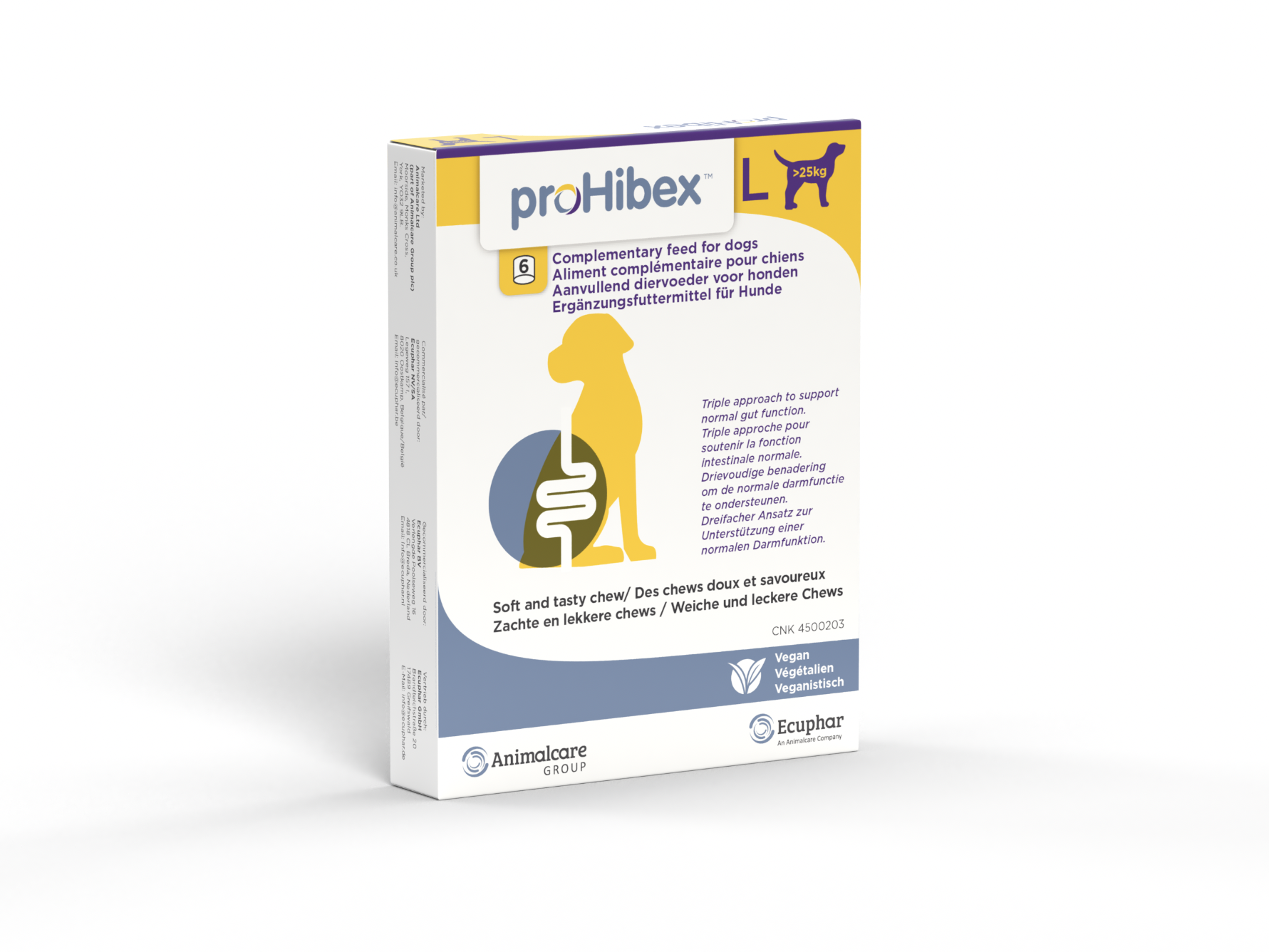 proHibex® ist ein schmackhafter, weicher Chew, der schnell zur Wiederherstellung der normalen Darmfunktion Ihres Hundes bei Magen-Darm-Erkrankungen beiträgt.